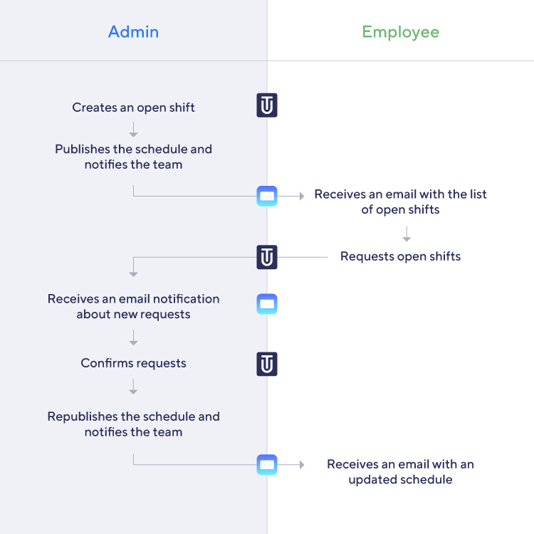 After receiving the email, employees need to go to the app and click the "hand" icon next to the shift – this is called "requesting a shift". The system will then check newly added requests a few times per hour, and if there are any new requests, all shift admins for that location will receive a notification email about newly added requests.