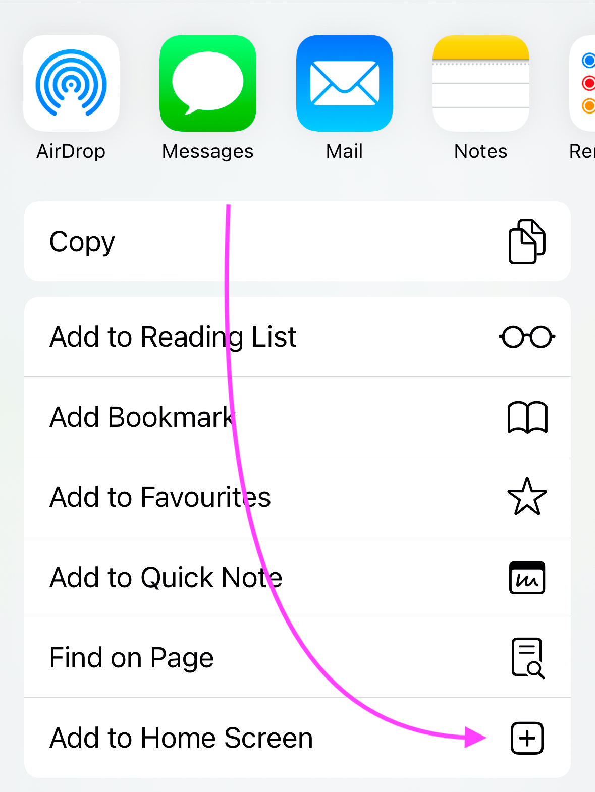 - Scroll down the list of options, then tap Add to Home Screen.