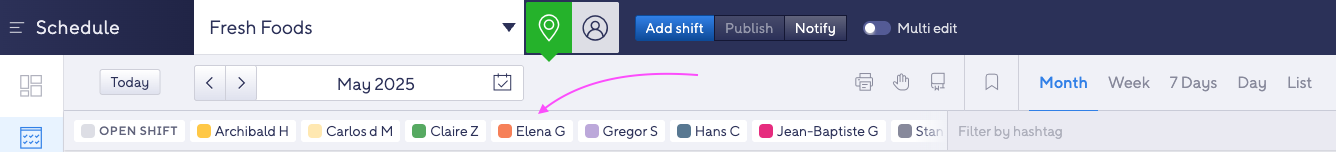 You can easily add, copy and move shifts by dragging and dropping them – either from the so called "assignment bar" (also called the pills bar) . You will find it just above the calendar view. It’s where you can drag employees or locations into the calendar to create shifts. Depending on the selected view mode (employee mode or location mode), the bar will display either locations assigned to the selected employee or employees assigned to the selected location. The assignment bar also includes the tag filter, which can filter both the calendar view and the pills in the assignment bar, depending on the selected tags.